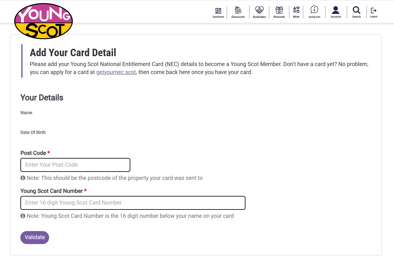 You should select ‘Add Young Scot Card’ and enter your post code and 16 digit card number. Your card number is under your name on your Young Scot National Entitlement Card.