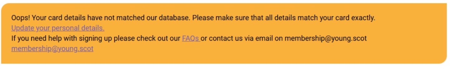 If you get the message below, this indicates some of the information you have entered doesn’t match the details on your card. Your full name, date of birth and postcode should match exactly. The postcode you should enter is the postcode your card was sent to. If you are having any problems linking your card, email us at membership@young.scot. We’ll help your resolve this so you can apply for the Young Carers Package.